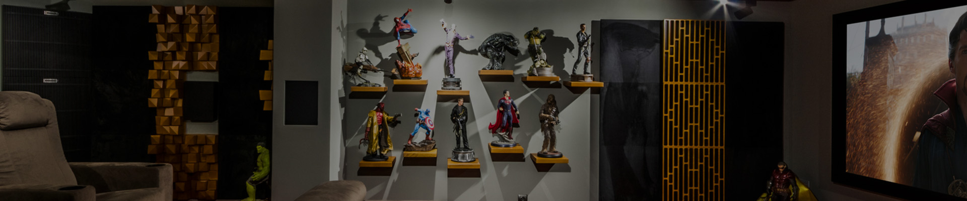 Figyelemre méltó filmes relikviával rendelkező ügyfél számára készült 30 m2-es, két soros mozi terem, UHD vetítővel, széles képarányú vászonnal.