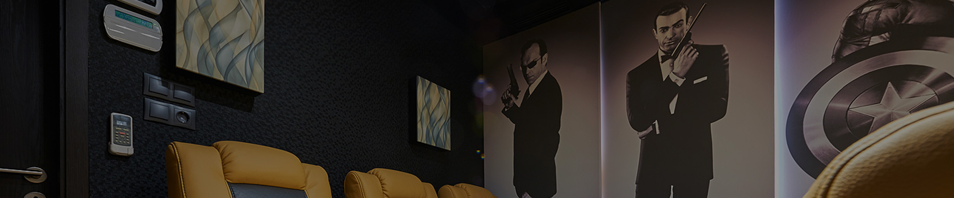 25 m2-es, hangáteresztő és digitálisan megnyomott panelekkel, 2,8 m széles vászonnal és egyedi tervezésű bútorokkal ellátott magán mozi.